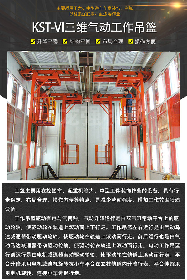 工籃主要用在挖掘車、起重機等大、中型工件裝飾作業(yè)的設備,具有行走穩(wěn)定、布局合理、操作方便等特點,是減少勞動強度,增加工作效率噴漆設備。