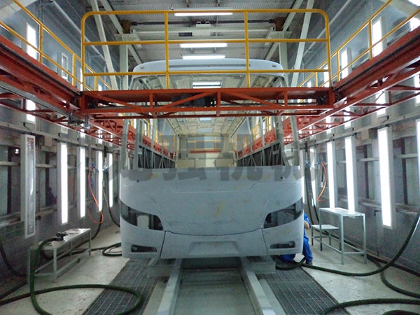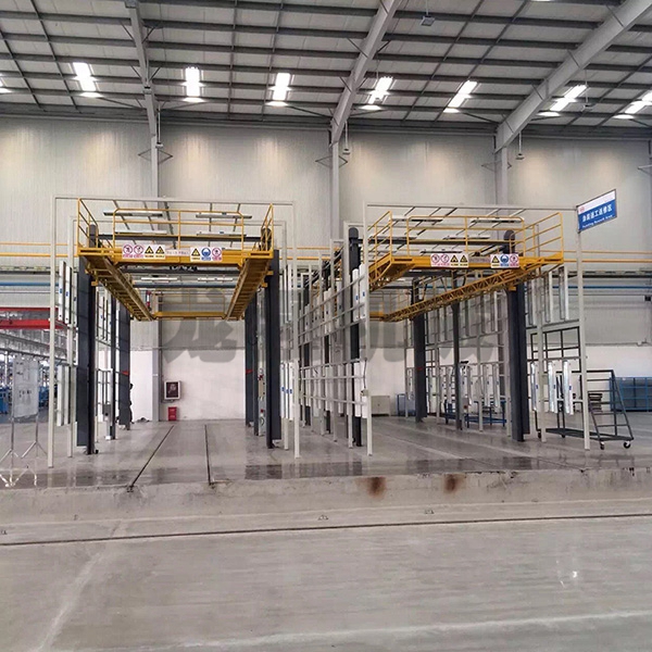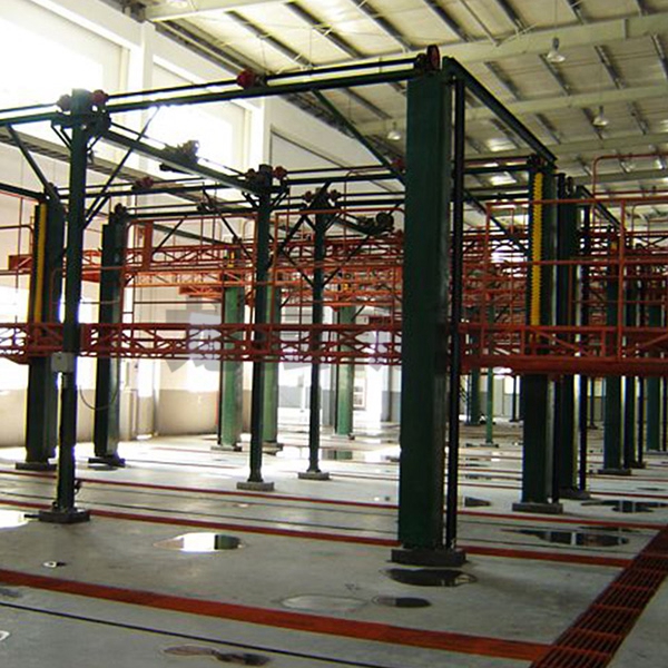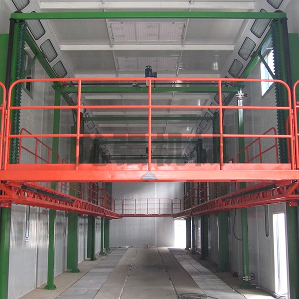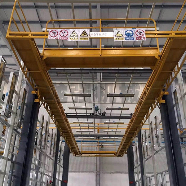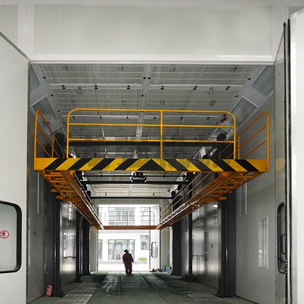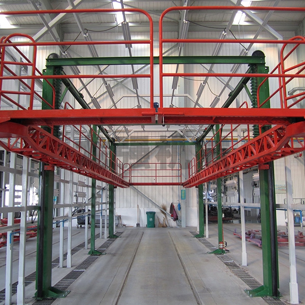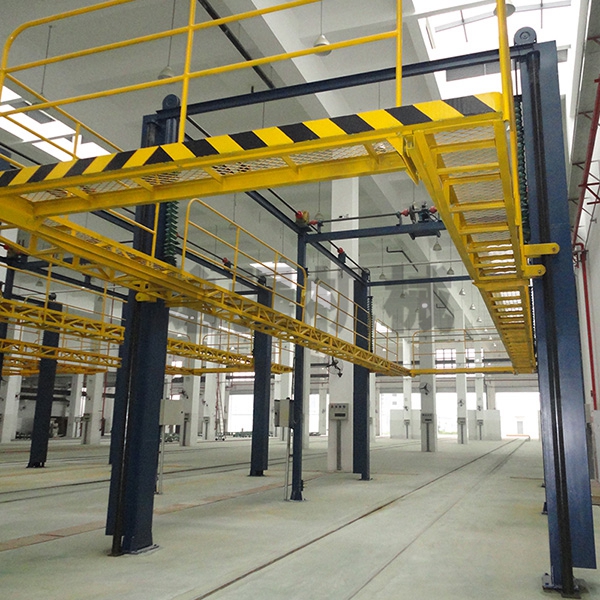 本設備系采用電機連接減速機減速后,通過多軸及鏈輪、鏈條的機械傳動方式改變運動方式,以導向柱導向輪等組成的導向機構,使得操作平臺升降過程的相對穩定和整機剛性,在邊立柱的鏈條一端加配重錘,以減少電機工作負荷,減少振動幅度,以達到平臺升降平穩的目的,并在平臺貳端設有移動小車,以適應不同車長的需要。采用鋼絲繩保險裝置,鋼絲繩兩端分別與平臺及配重錘連接。當鏈條發生斷裂時,因鋼絲繩與平臺配重錘連接不至于平臺突然下墜,以便操作人員能及時調整平臺,從而使得操作人員的人身健康。